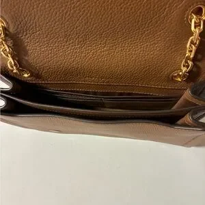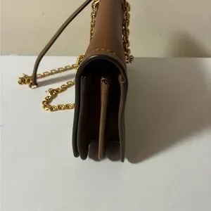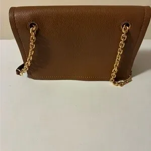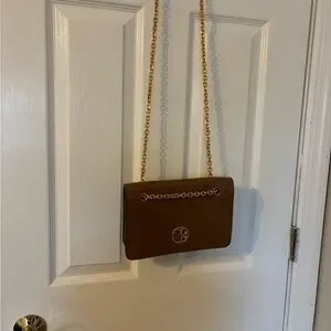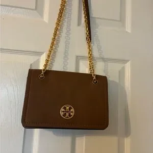 Stylish Tory Burch crossbody bag in tan. Features a gold chain strap and iconic logo detail. Can be worn on the shoulder or crossbody. The double gusset interior offers a little organization for your day to day essentials. Only used once. Excellent new condition in a beautiful pebbled leather. Smoke and pet free.