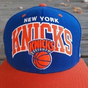 Mitchell & Ness New York Knicks NBA basketball blue wool snapback hat. Solid blue fabric with orange bill, embroidered New York Knicks front graphic, side embroidered NBA logo, back embroidered Mitchell & Ness logo, and adjustable plastic snapback closure. In excellent condition! 100% wool. One size.