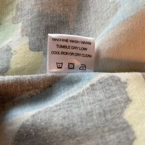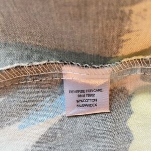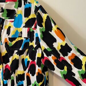 Colorful cotton/spandex jacket with abstract splashes of black, blue, green, red, orange and yellow on a white background. Jacket is designed in the style of a Jean jacket but is lightweight. Excellent pre-owned condition with no visible flaws.