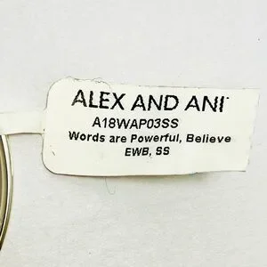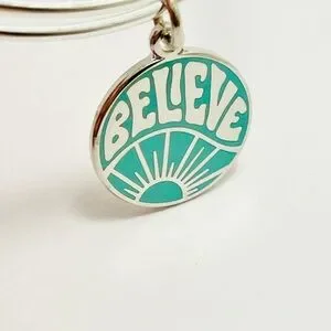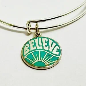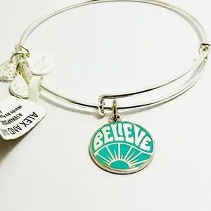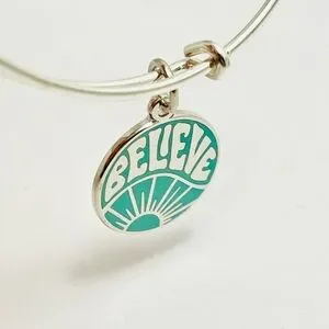 Elegant shiny silver Alex and Ani bracelet featuring a teal 'Believe' charm. Ideal for daily motivation.