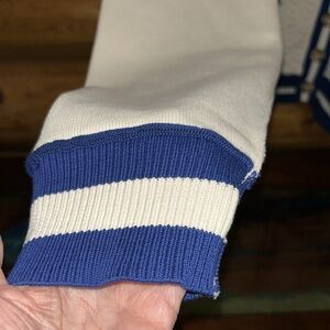 Stylish cream cardigan with blue accents. Features textured knit and ribbed cuffs. Perfect for layering.