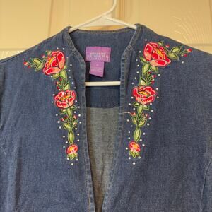 Suzanne Somers Collection Embroidered Floral Rhinestone Denim Shirt Size S Hook Closure