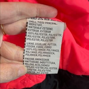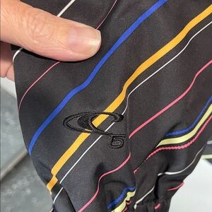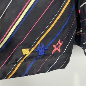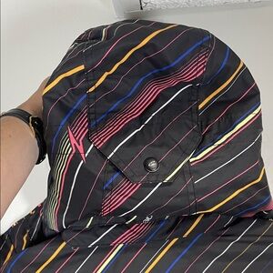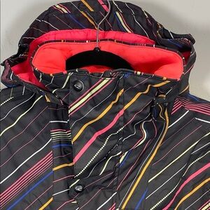Stylish black jacket with vibrant multicolor stripes. Warm and perfect for skiing or snowboarding.