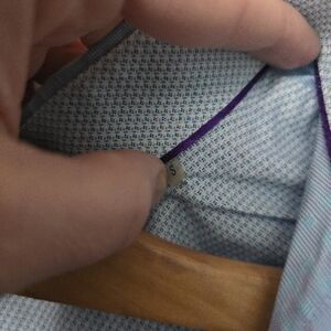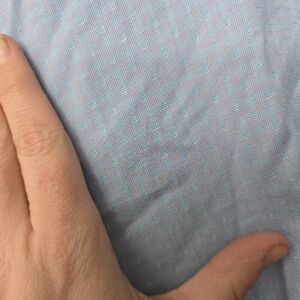Blue shirt with undertones of pink.