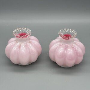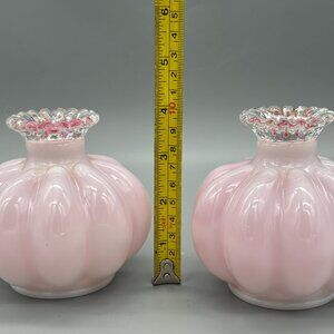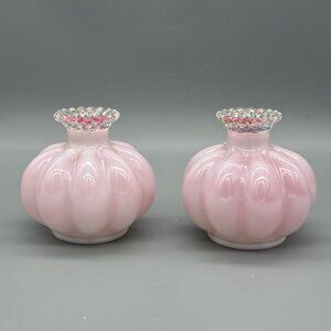 Fenton 1940's Silver Crest Ruffled Pink Glass Melon Perfume Bottle Vase Set of 2