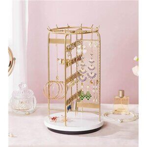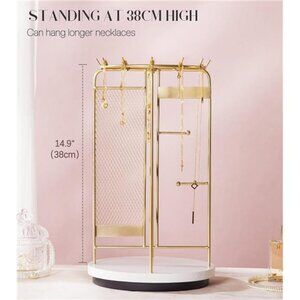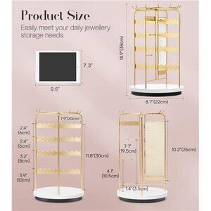 High Capacity and Aesthetic: The metal frame and MDF tray of this vanity organizer ensure it's aesthetic and stable. It's an large space-saving storage addition to your vanity, can hang 100+ pairs of ear studs, 48+ earrings, 34+ necklaces, 22+ rings, 18+ bracelets, and other accessories,with a base diameter of only 8.66 inches but total height of 14.96 inches.