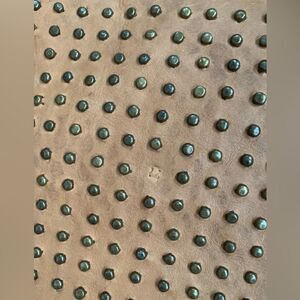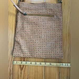 Lightly used. Tan leather with brass studs throughout. One stud is missing (see picture). Has an adjustable and removable strap, one outer zip pocket, zip closure with leather pulls, and one inner zippered pocket. Made In Italy. This brand is sold at Anthropologie. Measurements included.