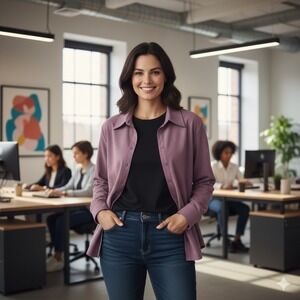 A stylish purple button down long sleeve shirt crafted from a comfortable stretch suede-like fabric. This versatile top offers a flattering silhouette with its well-defined seams and classic collar. Perfect for a professional office environment, a casual brunch outing, or an evening dinner date.