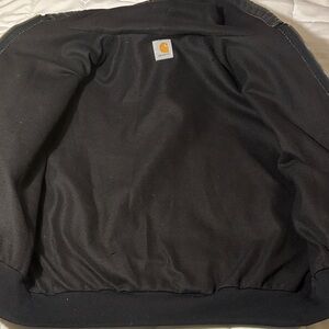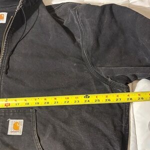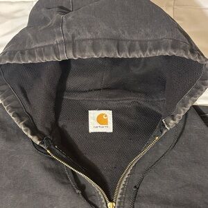 Vintage 90s Carhartt distressed faded sandstone black hooded canvas heavy duty work wear coat utility jacket. Features front pockets and sturdy zip closure. Used, distressed condition with some fading, light staining, and small hole . Tagged Carhartt without a size tag, fits like an adult Extra Large (XL) - Please see measurements to be sure on the size!