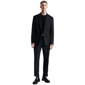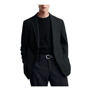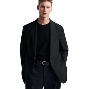 This is a black slim fit blazer jacket by Zara Man. -Notched lapel collar -long sleeves with buttoned cuffs -padded shoulders -Welt pockets at chest and hip -Interior pocket -Central back vent at hem -Front button closure -fully lined -57% polyester 41% wool 2% elastane -Laid flat measurements: across armpit to armpit 20in, length 28.5in, across shoulders 17in, sleeve length 25.25in *No size tag; refer to above measurements for fit. In excellent pre-owned condition.