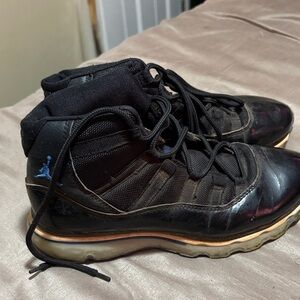 Sleek black sneakers with blue highlights. Perfect for athletic activities. Offers comfort and style.