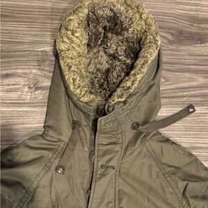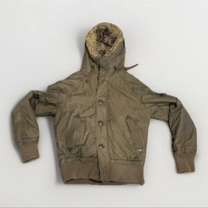 Step back into the early 2000s with this RARE Y2K American Eagle Outfitters Bomber Jacket in size Small (S/P). Classic military-inspired army green with a faux fur sherpa-lined hood and ribbed cuffs/hem for that iconic Y2K streetwear look.