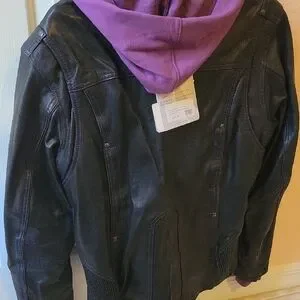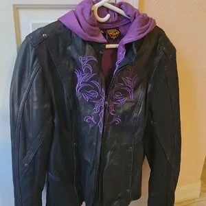 Fits like a large. zip out purple hooded lining. zip out hoodie is not manufactured by Harley. Just the jacket is.
