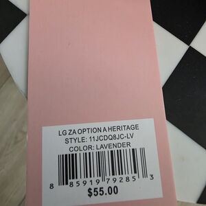 Elegant lavender wallet with gold chain detail. Includes removable pouch. Embroidered logo adds charm.