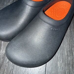 These are a like new pair of Crocs on the clock slip resistent work clogs. These incorporate the orange foam insert that the basic on the clock clogs do not. They are perfect for any chef or kitchen work, food server, nurse or healthcare aid or anyone who wants a comfy and supportive shoe. Besides a little bit of dirt on the bottom....they are in excellent condition. Mens size 8 or ladies size 10. #crocsontheclock #crocsworkshoes #crocchefclogs