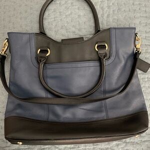Elegant Tignanello satchel/shoulder bag in blue and black with a front and back pocket on the outside. Attractive lining which includes a middle divider with zipper, one side includes an inside pocket with zipper and other side includes 2 cell phone pockets . Perfect for daily use. Stylish and functional. Approximate measurements are 15inch wide by 12inch tall, and shoulder strap drop is approximately 12'. Nice metal feet on the bottom of bag. Never been used and still has partial tag attached.