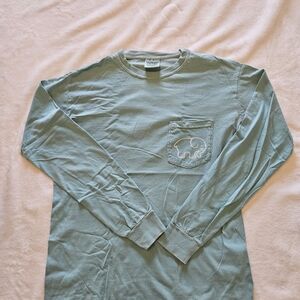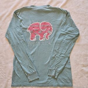 Teal long sleeve shirt with a pink patterned elephant graphic. Casual and trendy design.
