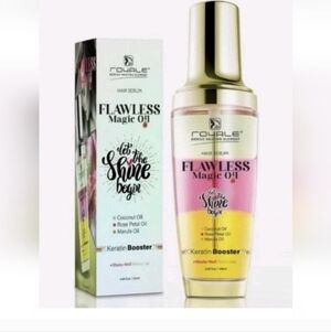Royale Flawless Magic Oil Hair Serum. It is a multi-purpose hair serum that contains coconut oil, rose petal oil, and marula oil, along with a keratin booster.