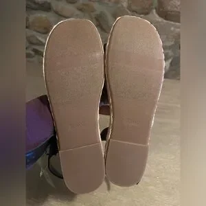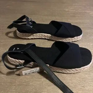 Stylish black sandals with tan woven sole. Adjustable ankle strap. Comfortable and chic.
