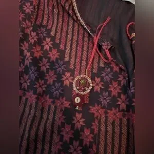 tags: boho bohemian hippie women mature modest batwing bat wing tassel decorative beading patterned printed tunic blouse long shirt sits below waist relaxed fit pink red maroon brown black Made in India lined lining