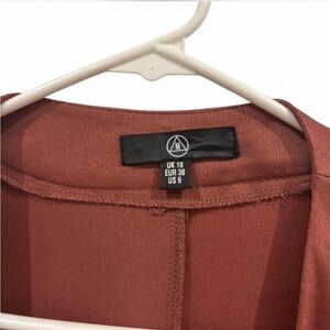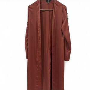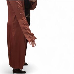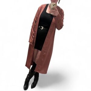 Dusty rose satiny duster/robe with buttons down the sleeve. Has a very vintage vibe. Brand is Missguided. Size 6. For reference, I am 5'5, 130 pounds and wear between a small and medium. Has a couple small snags/loose threads, but not noticeable unless looking. Overall, in great condition.