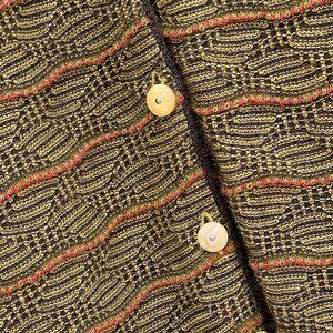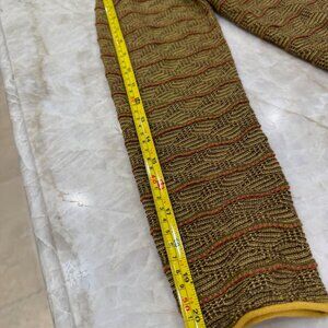 This cardigan boasts yellow Mother of Pearl quarter shank buttons with gold centers and is made of 71% Baby Alpaca with 29% Pima Cotton, so it is both soft and lightweight. The four yarn colors used (butter yellow, olive green, dark chocolate brown and rusty red) all blend together beautifully, giving a warm autumnal vibe. Perfect for Fall and Winter! NEVER WORN.