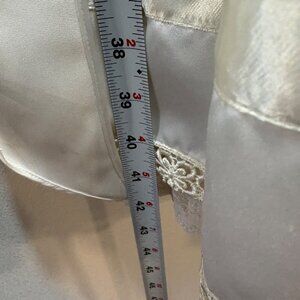 Minor faint marks on satin skirt, visible upon close inspection. Light wear. Top to bottom = 41 inches.