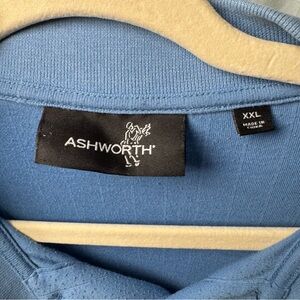 Two Ashworth Golf cotton polo shirts with slight pilling from wash wear. Light blue has small stained area on front below embroidered logo.