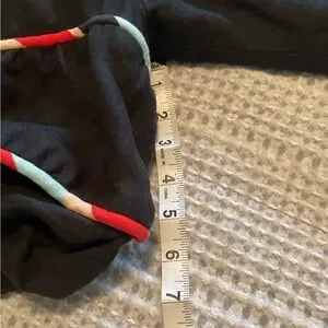 Black mini dress with vibrant accents. Features puff sleeves and a playful design. Perfect for any occasion.