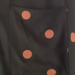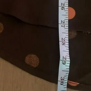 This is a Loft long-sleeve blouse in excellent condition. It features a stylish black color with tan/brown polka dots, perfect for adding a touch of fun to your outfit. The blouse has a collared neckline and a front pocket, combining classic and casual elements. It has been professionally dry cleaned and is ready to wear. Please note that the blouse runs large, so it offers a relaxed, comfortable fit. There is also a matching knit skirt available for sale.