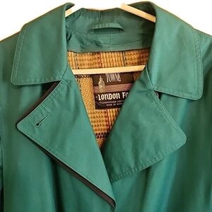 This Vintage London Fog Towne Teal Zip-Lined Belted Trench Coat in women's size 12 is a stylish and classic piece with a Y2K aesthetic. Made of polyester outer shell and polyester lining, this long trench coat features a solid green color, long sleeves, and a button closure. The coat is perfect for various occasions such as travel, casual outings, and business meetings, with accents like pleats, buttons, and a logo detail. The regular fit and breathable design make it a versatile addition to your wardrobe for all seasons, especially winter, fall, and spring.