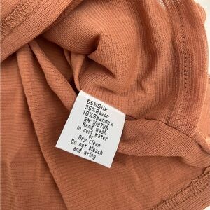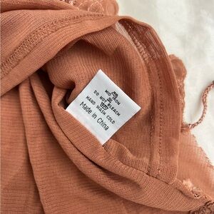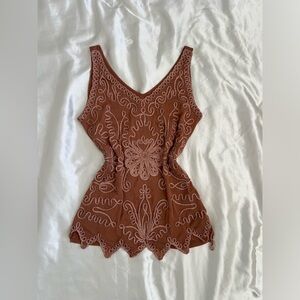 Beautiful vintage rust-colored tank top featuring intricate pink embroidery and a scalloped hem. Made from a soft silk-blend knit (55% silk, 35% rayon, 10% spandex) that feels lightweight and slightly stretchy. The front is fully embroidered with a floral pattern, while the back is smooth and simple.