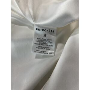 Retrofete 'Priscilla' White Acetate Feather Dress Size S: a midweight satin fabric with ostrich feather trim and a side seam slit, it is double lined and has a hidden back zipper closure and back tie closure, measurements: 16 inch bust width x 14 inch waist across x 18 inch hip across x 54 inch length, light fabric pulls on lower skirt near the hem and under the feather trim, light discoloration on bottom of feather trim at the hem, discoloration on the inside near the brand tag that's not visible on the outer, feather trim is detachable but dress is not wearable without it.