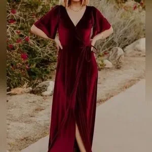 Chic deep red maxi dress with wrap design. Perfect for elegant occasions. Flattering and stylish.