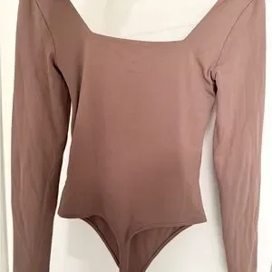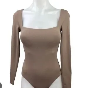 Chic taupe bodysuit with square neckline. Long sleeves for a sleek look. Ideal for layering.