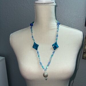 Handcrafted beaded necklace with shades of blue glass beads. Gorgeous colors.