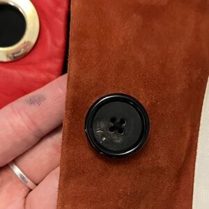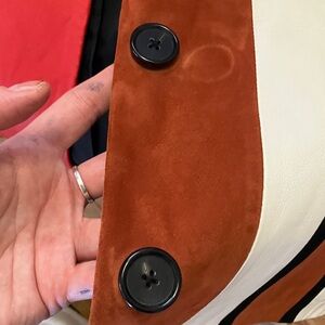 Mix of buttery suede and smooth leather seamed together - orange red, whiskey brown, cream white and black