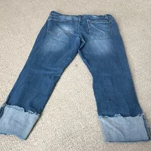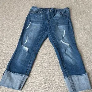 Stylish blue jeans with distressed details. Ankle length with rolled cuffs. Perfect for casual wear.