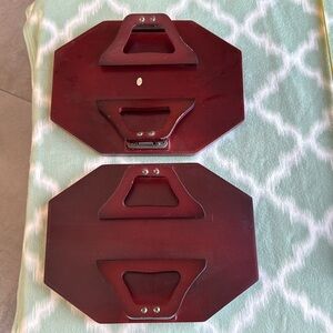 Set of two wooden octagonal trays. They have spring loaded clamps that will fit onto most arms of sofa or chairs. Perfect for your seating space or home theater. About 12.5x9.5”.