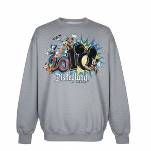 This gray crewneck features a vibrant front graphic with Mickey Mouse, Donald Duck, Goofy, and other characters, along with the '2010 Disneyland Resort' logo. by Hanes, it's perfect for Disney enthusiasts and collectors of vintage theme park memorabilia.