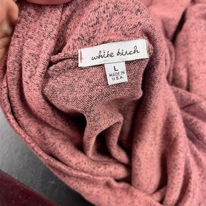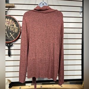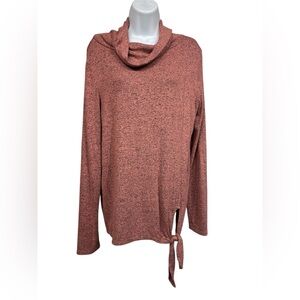 Heathered rose knit top. Cowl neck, relaxed fit, and knot on lower left hem. Soft, stretchy knit.