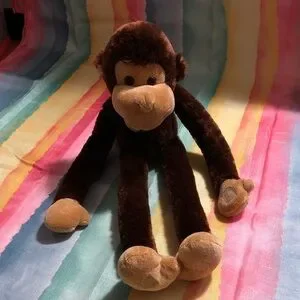 Soft and cuddly plush monkey toy in brown and tan. Perfect for kids to snuggle and play with. Velcro on hands and feet so he can hang around any room in your house.