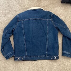 Classic dark blue denim jacket featuring a warm cream sherpa collar. Ideal for layering.
