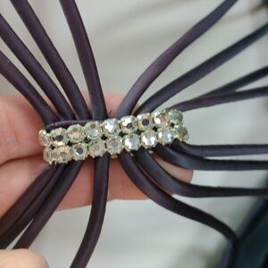 Has a little bit of a Goth feel, accenting curves, and the strappy back that reminds me of a spider web. Crystal buttons, crystal accent in the center of the "spider web" in back.