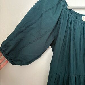 Features soft puff sleeves, airy tiered silhouette, and elastic neckline that can be worn on or off the shoulder. Made from breathable 100% cotton in a rich deep-teal tone (gorgeous jewel-tone neutral that flatters so many skin tones!).