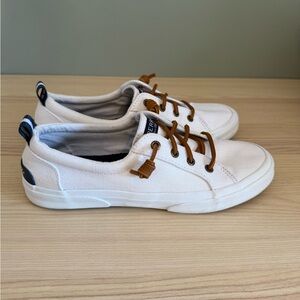 White Canvas Sperry Sneakers with Brown Leather Laces Boat Shoes