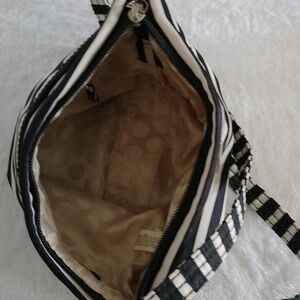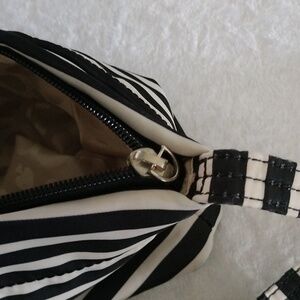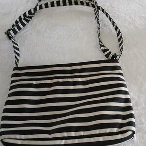 Stylish shoulder bag with bold black and white stripes. Features adjustable strap. Iconic Kate Spade logo accent.