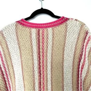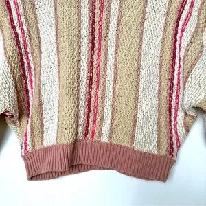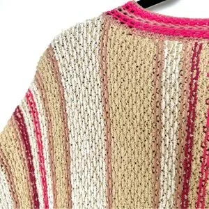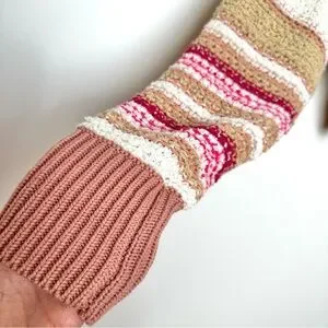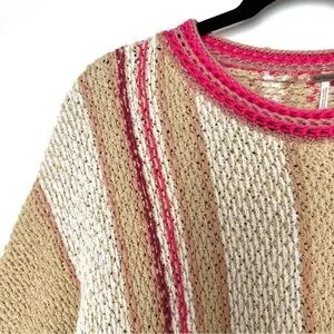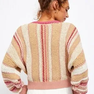 The Free People “Show Me Love” sweater channels easygoing boho style with a cozy twist, featuring chunky knit construction and soft vertical bands in earthy tan, warm beige, and dusty pink. The wide vertical stripes are accented by narrower, randomly placed lines that add a playful sense of movement and texture. Designed with a cropped fit and relaxed dolman sleeves, this sweater balances structure and slouch for that effortlessly undone Free People look.