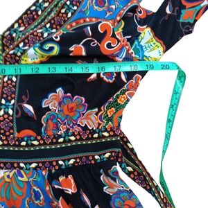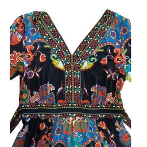 Bohemian style dress with vibrant floral patterns. Features a mix of black, red, and green colors.