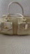 Chic Coach satchel in beige with silver accents. Features dual front pockets and elegant hardware.